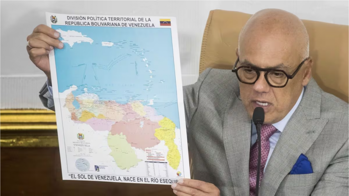 El presidente chavista de la Asamblea Nacional, Jorge Rodríguez, muestra un mapa de Venezuela con la anexión del Esequibo, durante una sesión en Caracas. MIGUEL GUTIERREZ (EFE)