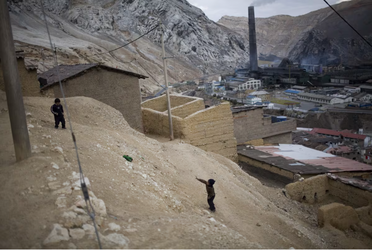 Niños juegan en las colinas frente a la planta metalúrgica Doe Run, en La Oroya, Perú, en una fotografía de archivo. Foto David Rochkind (Getty Images)