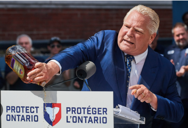El premier sacó una botella de Crown Royal y la vació lentamente al final de una conferencia de prensa no relacionada, instando a todos a hacer lo mismo y dejar de comprar el producto, en su lugar, a apoyar a las empresas que elaboran whisky en Ontario.