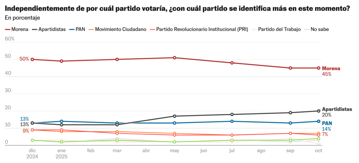 Entre mayo y septiembre, la cifra de mexicanos que se identifica con Morena ha caído seis puntos, al pasar de 51% a 45%. El periodo de la caída coincide con el verano negro de Morena, cuando varias de sus principales figuras estuvieron en el centro de la polémica por sus derroches en sus vacaciones, sus fortunas inexplicables y los vínculos de sus colaboradores con el narco.