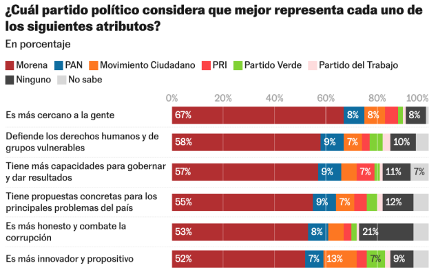La caída de la aprobación de Morena puede parecer testimonial, pero indica el malestar de los mexicanos con la corrupción. El expresidente Andrés Manuel López Obrador decía que ese era el principal problema del país, y una de las banderas de su movimiento era, precisamente, el combate a ese flagelo, con resultados discutibles en la práctica. Según la encuesta, el 21% de los ciudadanos considera que Morena se parece al resto de los partidos en que no es más honesto ni ataca la corrupción, uno de los indicadores en los que sale peor evaluada la formación guinda.