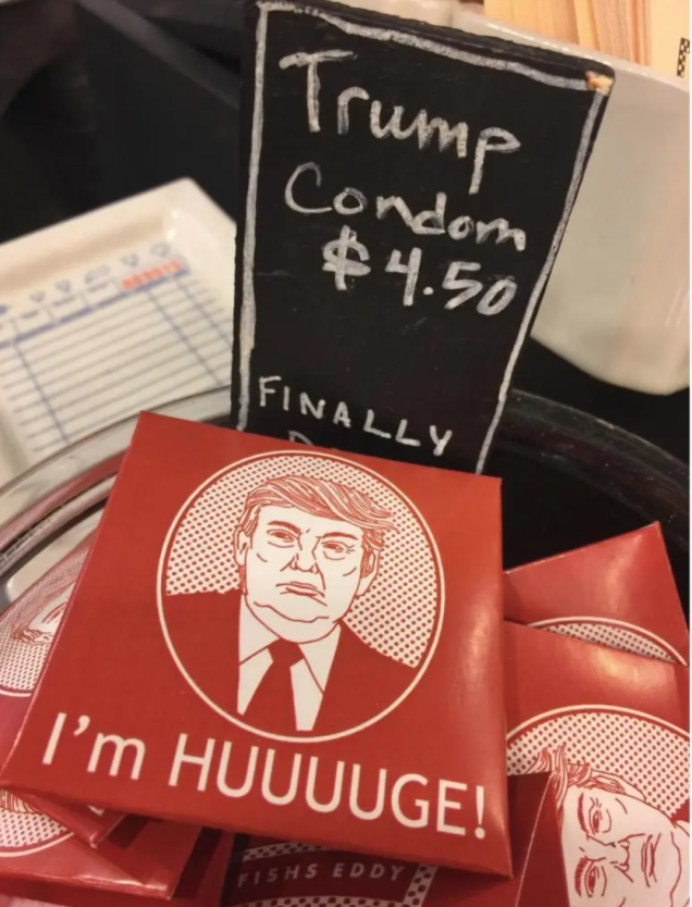 - Una de las imágenes muestra condones con un dibujo de la cara de Trump