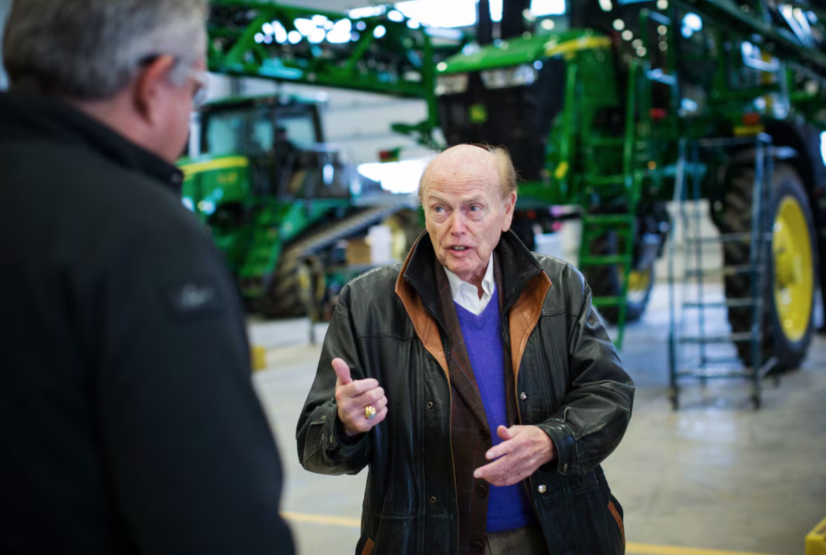 Jim Pattison, director ejecutivo y fundador de Jim Pattison Group, habla con un trabajador en un concesionario de Deere & Co. en Yorkton, Saskatchewan, en una foto de archivo. Ben Nelms (Bloomberg)