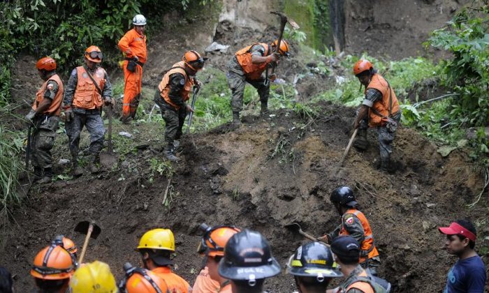 Miembros de los cuerpos de socorro y del ejército participan en el rescate de al menos tres personas desaparecidas tras un deslizamiento causado por las lluvias en Ciudad de Guatemala. Foto: Saúl Martínez / Efe