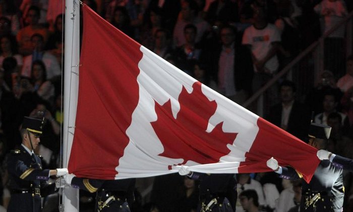 Un grupo de cadetes izan la bandera de Canadá, tras el anuncio de Toronto como próxima sede de los Juegos Panamericanos, durante la ceremonia de clausura de los Juegos de Guadalajara. Foto: Roberto Escobar / Efe