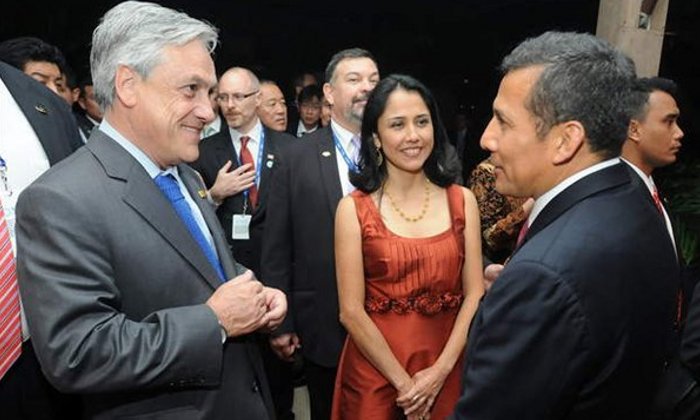 El presidente de Chile, Sebastián Piñera, conversa este domingo con su homólogo peruano, Ollanta Humala, y con la esposa de éste, Nayine Heredia, durante la cena de honor a los líderes de los países del Foro de Cooperación Asia-Pacífico (APEC), en Honolulu, Hawai (EE UU). Foto: Presidencia de Chile / Efe