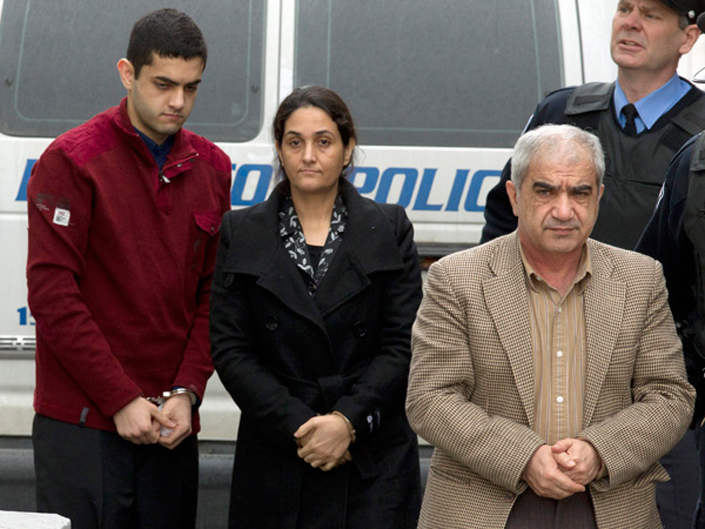 Mohammad Shafia (dcha.), Tooba Yahya (centro), y su hijo Hamed Shafia (izq.) son escoltados en el palacio de justicia de Kingston, Ontario, el 26 de enero de 2012 (Foto: Frank Gunn/The Canadian Press).
