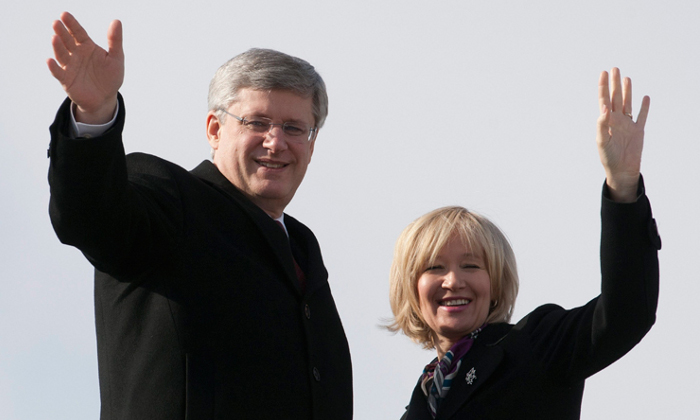 El primer ministro, Stephen Harper, y su esposa, Laureen, saludan en Ottawa antes de partir hacia China, este lunes. Foto: Adrian Wyld / CP