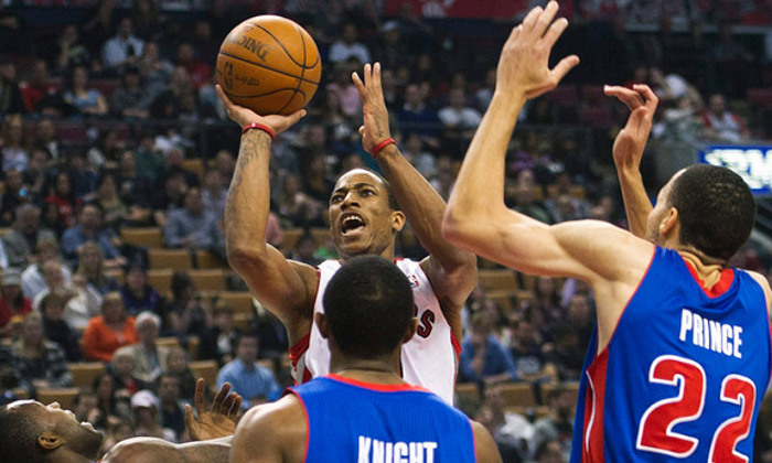 El escolta DeMar DeRozan, de los Raptors de Toronto, lanza a canasta ante la defensa de los Pistons de Detroit. Foto: Nathan Denette / CP