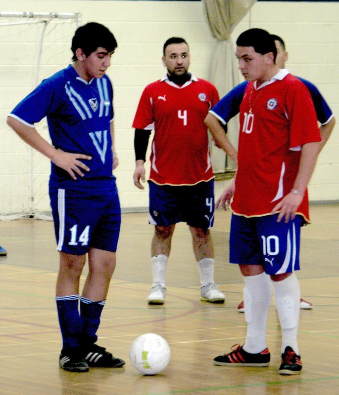 Keven Casella, de “Villa del Parque”, frente a Jonathan Osorio, del “Copihues Rojos”, ante la atenta mirada de Ramón Mella, en polémico partido en “La Original”