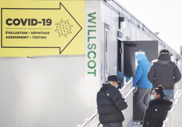 People wait in line to get tested for Covid-19 at a testing clinic in Montreal, Sunday, March 7, 2021, as the COVID-19 pandemic continues in Canada and around the world. THE CANADIAN PRESS/Graham Hughes