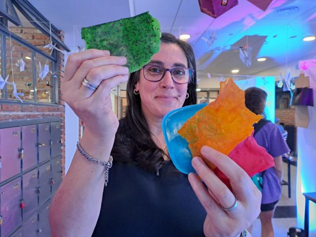 La profesora Paula Sapochnik sostiene placas similares al plástico elaboradas con biomateriales. ESCUELA TÉCNICA ORT ARGENTINA (CORTESÍA)