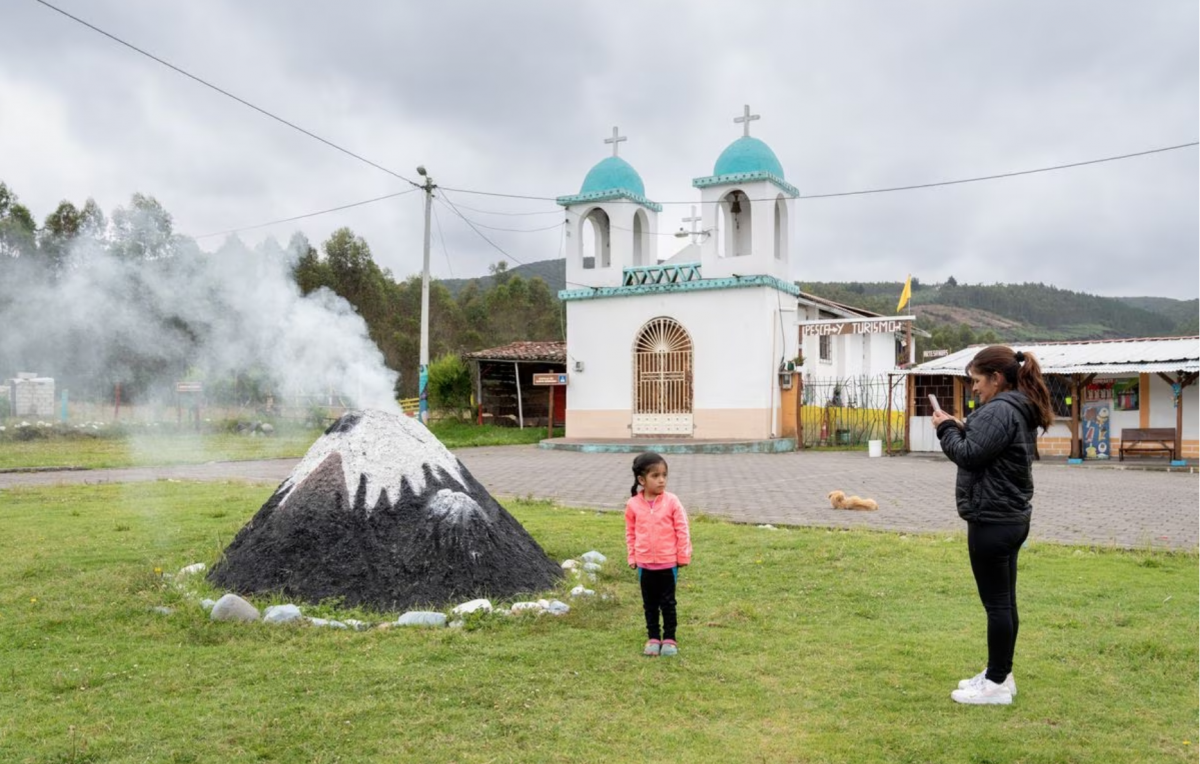 Personas se fotografían con una réplica del Cotopaxi en Ticatilín, una comunidad aledaña al volcán.