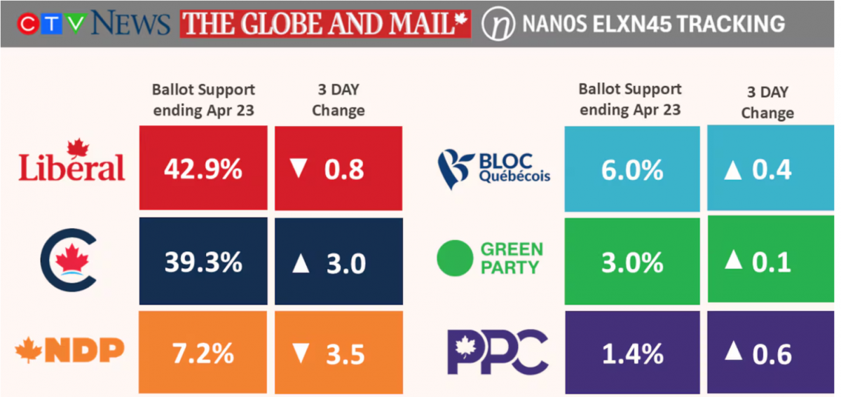 Una muestra móvil de tres días realizada por Nanos Research del 21 al 23 de abril muestra que los liberales superan en un 43% a los conservadores, quienes han subido en los últimos tres días hasta un 39% a nivel nacional.