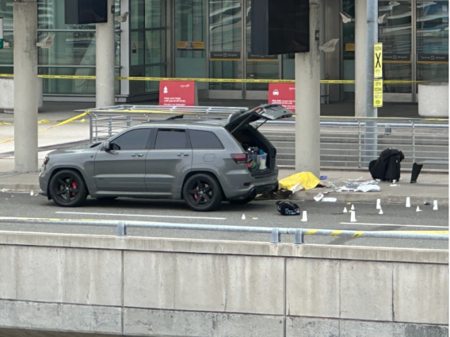 La escena frente a la Terminal 1 de Salidas del Aeropuerto Pearson después de un tiroteo con agentes involucrados el jueves 24 de abril de 2025. Foto de Jack Boland /Toronto Sun