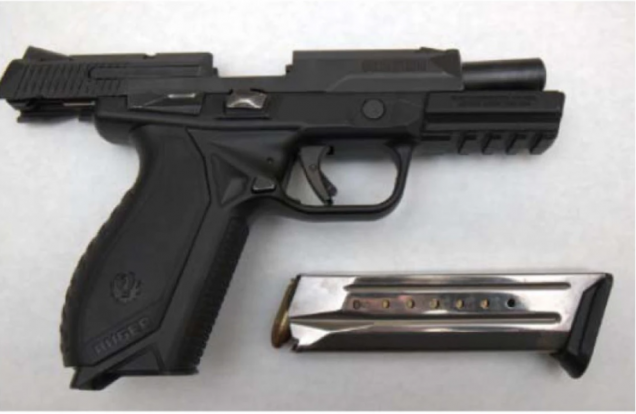 Esta pistola fue incautada durante el registro de un apartamento en el centro de Hamilton, tras un breve enfrentamiento que culminó con el arresto de un hombre y una mujer, ambos de 36 años, el miércoles 30 de abril de 2025. Foto: Handout / Policía de Hamilton.