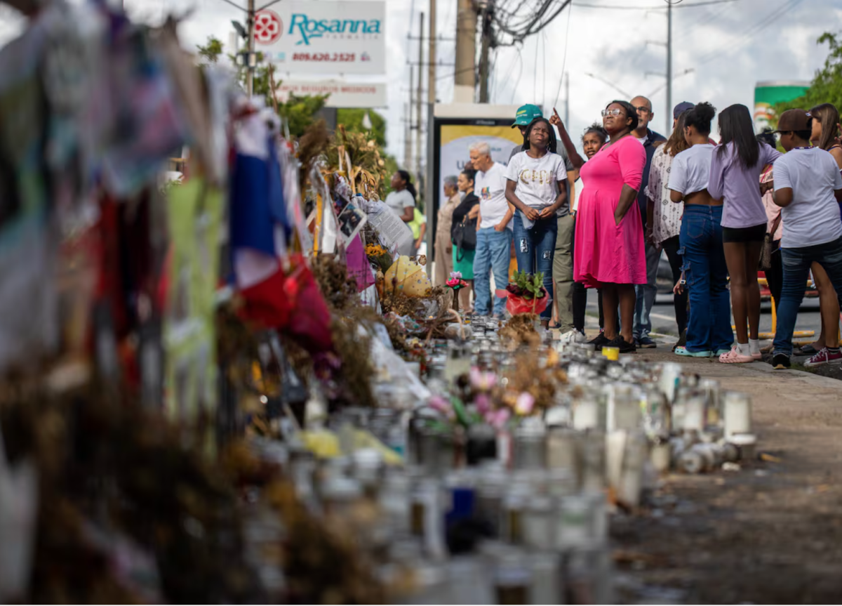 Las inmediaciones de la Jetset han estado repletas de gente desde la mañana del 8 de abril. Cientos de fotos, velas consumidas y otras recién prendidas, flores secas y frescas y letreros pidiendo justicia acordonan una discoteca custodiada día y noche por militares. Al fondo sigue intacta la valla publicitaria que anunciaba el concierto de Rubby Pérez. “Míralo ahí, papi”, le dice una señora a su padre, señalando una de las imágenes en blanco y negro ubicadas en el piso. “Máximo Peña, ahí está, mi amigo… Pobre”, dice tras un amargo suspiro.