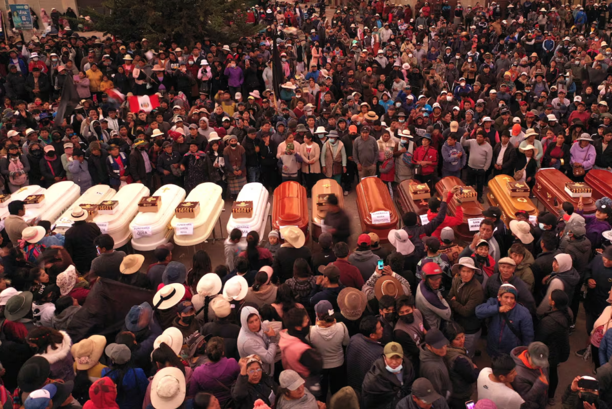 Familiares de víctimas de las represión policial en la ciudad peruana de Juliaca esperan la entrega de los cuerpos de los fallecidos ante los ataúdes vacíos. Foto Stringer (EFE)