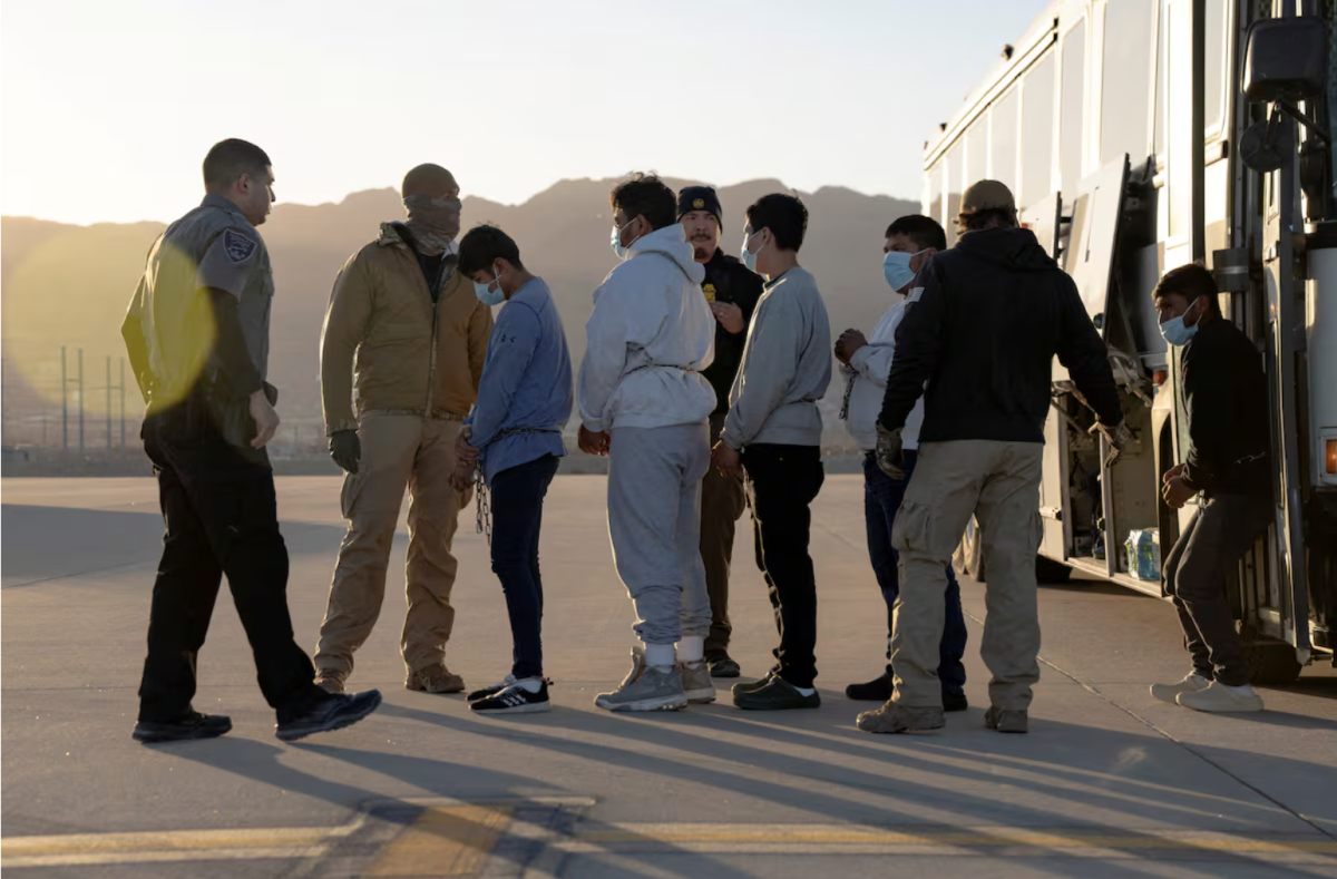 Agentes de seguridad de la Oficina de Aduanas y Protección Fronteriza guían a migrantes a un vuelo de deportación, en Texas, el 23 de enero de 2025. Foto Sgt. 1st Class Nicholas J. De La (via REUTERS)