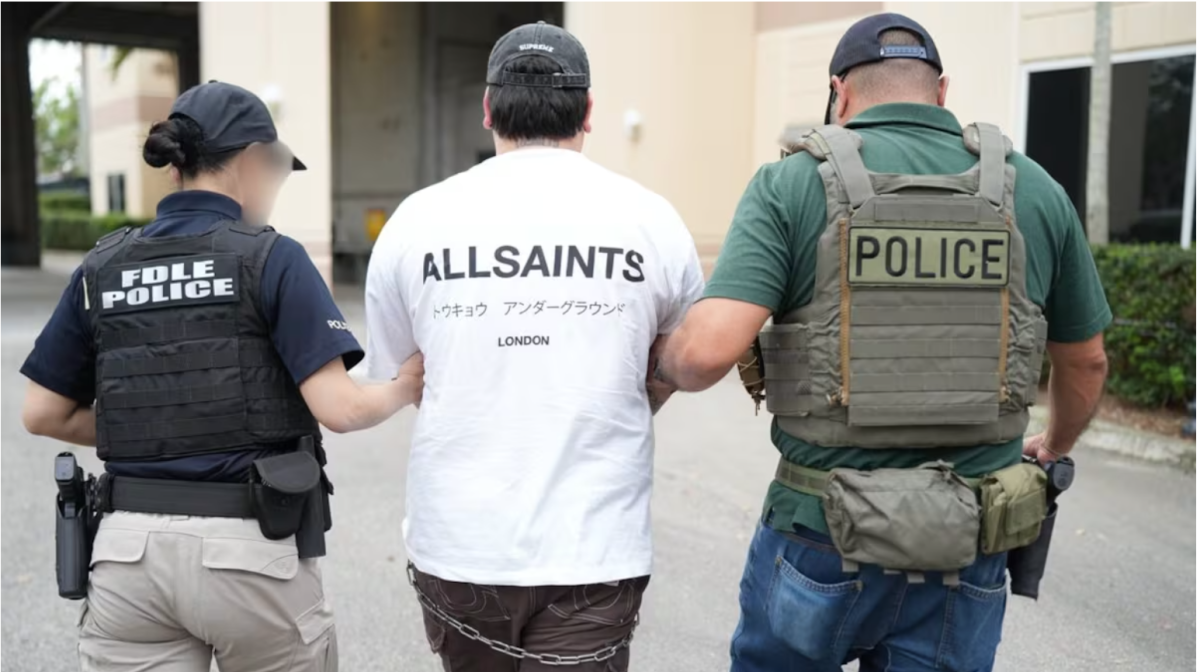Agentes de la policía trasladan a un detenido durante operativo migratorio, en Miami, el 1 de mayo de 2025. Departamento de Aplicación de la Ley de Florida (EFE)