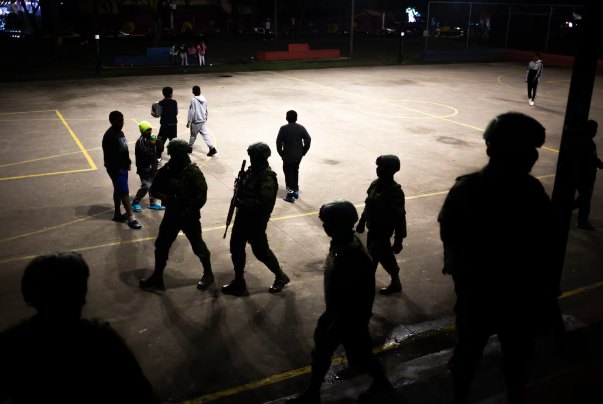 Militares ecuatorianos patrullan las calles del barrio de Solanda, al sur de Quito. Foto Vannessa Terán