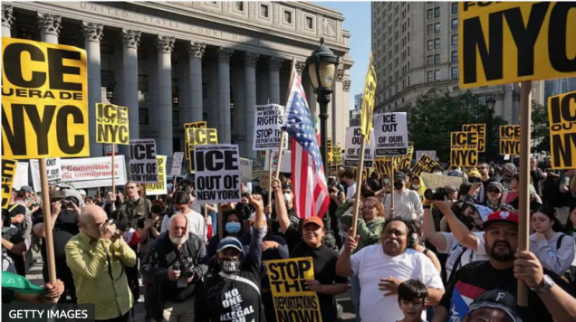 Llevaban consigo carteles que decían “ICE fuera de Nueva York” en español e inglés.