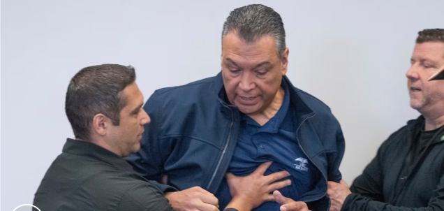 Alex Padilla, en el momento en el que lo sacan a empujones de la sala. Foto: David Crane (AP)