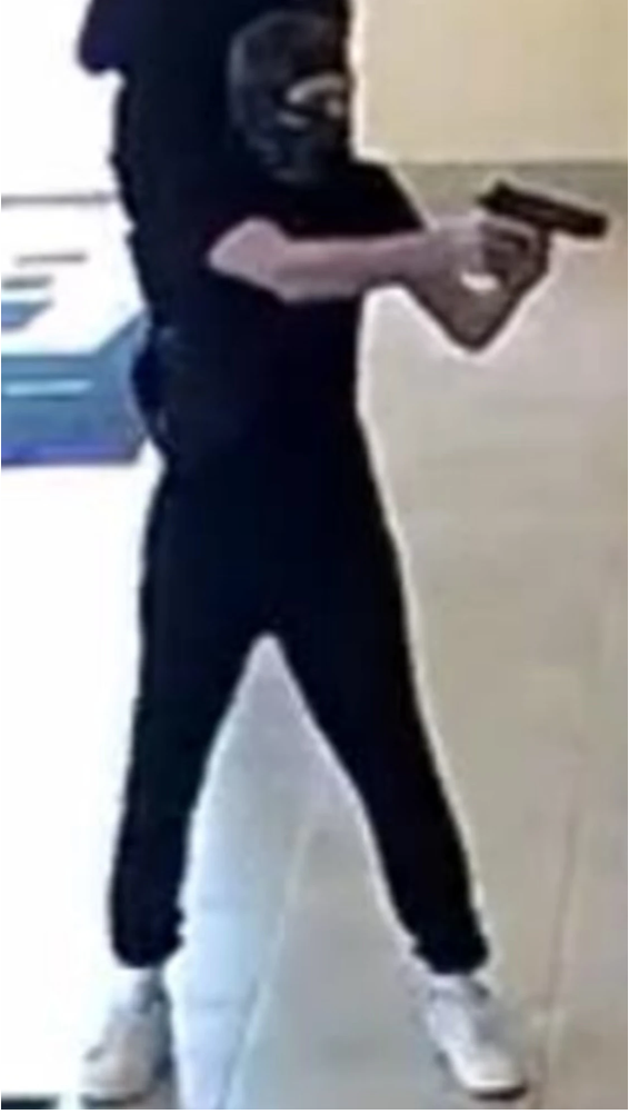 La policía busca a un sujeto blanco, descrito como de unos 22 años, 1,80 m de altura, complexión delgada y ojos azules. Vestía una máscara negra, camiseta negra, pantalones negros y zapatos blancos.
