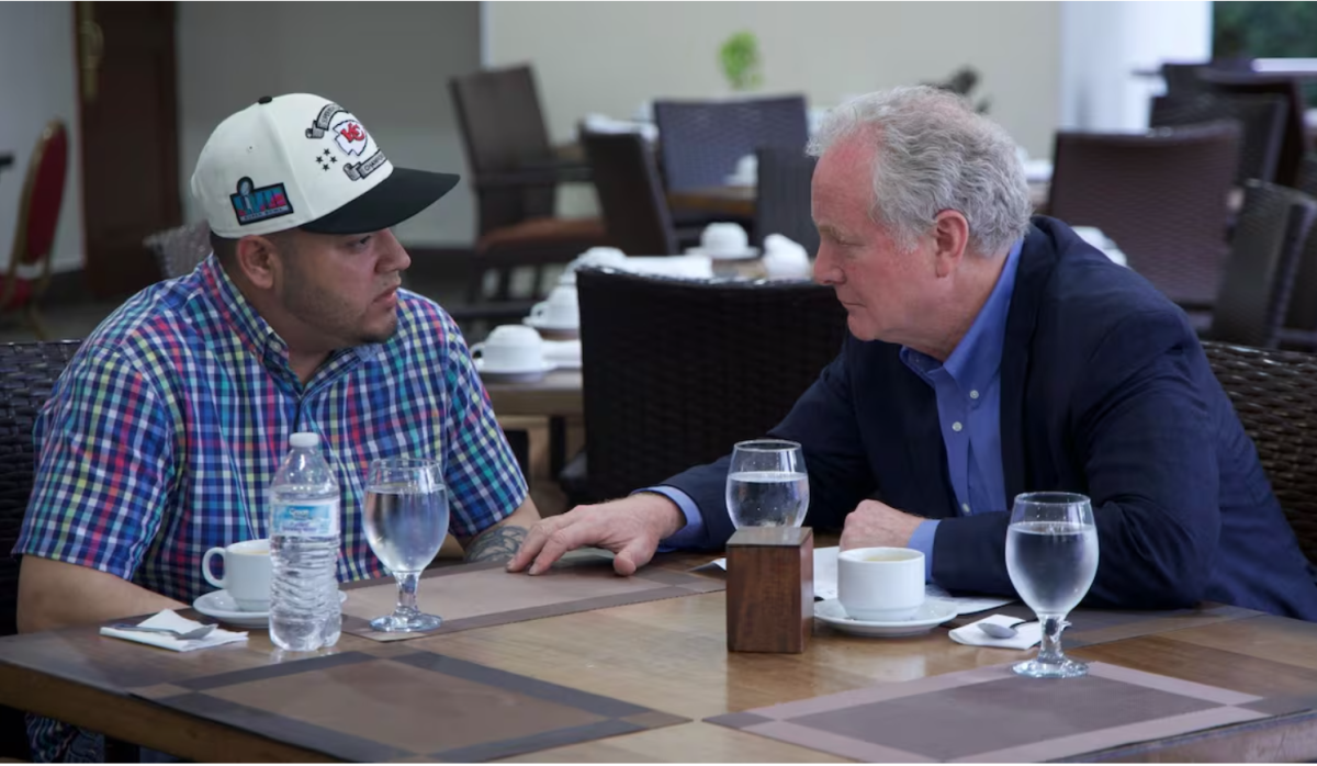 El senador por Maryland, Chris Van Hollen, habla con el migrante salvadoreño Kilmar Ábrego García, en abril pasado. Foto ChrisVanHollen (EFE)