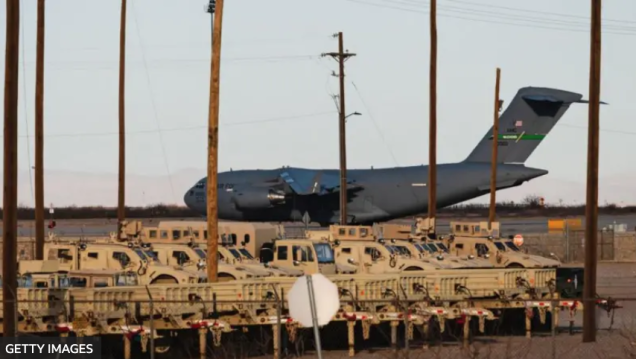 Un Boeing C-17 de la Fuerza Aérea de los Estados Unidos utilizado para vuelos de deportación en el aeródromo Biggs en Fort Bliss, El Paso, Texas.
