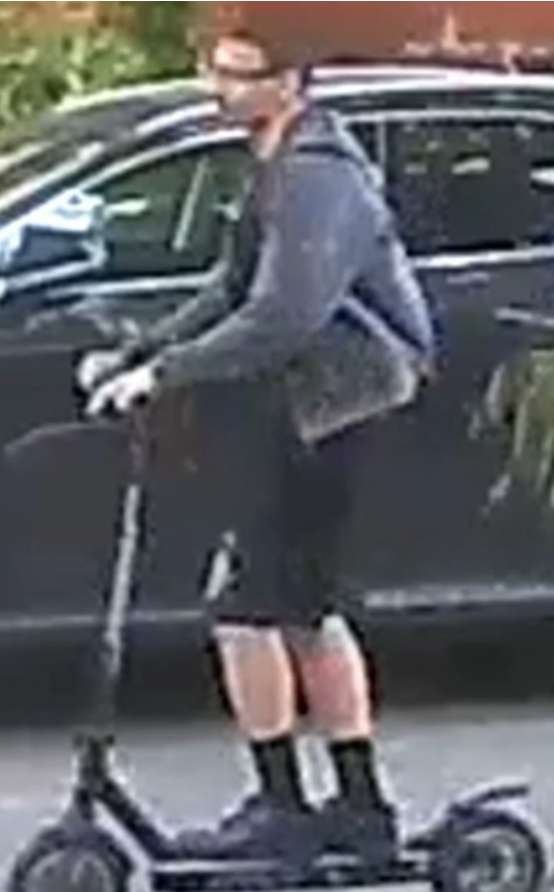 El depravado es de veintitantos años, de 1,68 m, de complexión delgada y cabello corto y oscuro. Llevaba gafas, sudadera oscura con capucha, pantalones cortos, calcetines y zapatos negros, y conducía una patineta eléctrica.