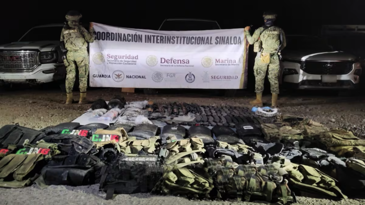 La Secretaría de Seguridad Pública de Sinaloa informó el miércoles del hallazgo de los chalecos. La dependencia explicó que marinos de la Armada habían detenido a seis personas en Culiacán, tres de ellas menores de edad, “luego de realizar trabajos de reconocimiento vía terrestre”. Los marinos les decomisaron “ocho armas, ocho camionetas, miles de cartuchos, marihuana, equipo para elaborar droga sintética y 516,030 pesos en efectivo”, algo más de 25.000 dólares. Varias fotos acompañaban al comunicado. En dos se veían los chalecos tácticos, con las siglas mencionadas.