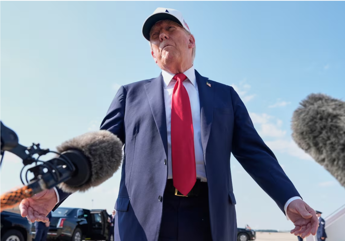 Donald Trump habla con los periodistas antes de subir al Air Force One para acudir a Iowa, Estados Unidos. Foto Associated Press/LaPresse (APN)