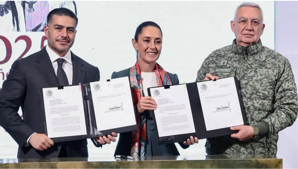 Omar García Harfuch, Claudia Sheinbaum y Ricardo Trevilla Trejo, durante la firma de las iniciativas en materia de seguridad, en Ciudad de México, el 11 de febrero de 2025. Foto Gobierno de México