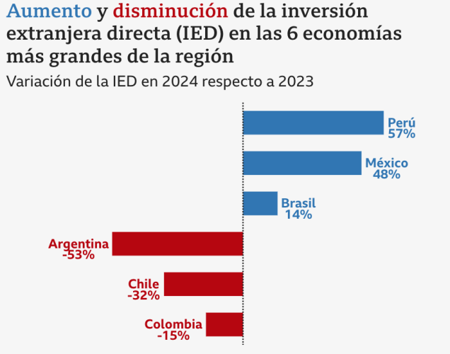 - Entre las grandes economías de América Latina, Perú, México y Brasil lideraron el aumento de la inversión extranjera directa en 2024 en comparación con el año anterior.