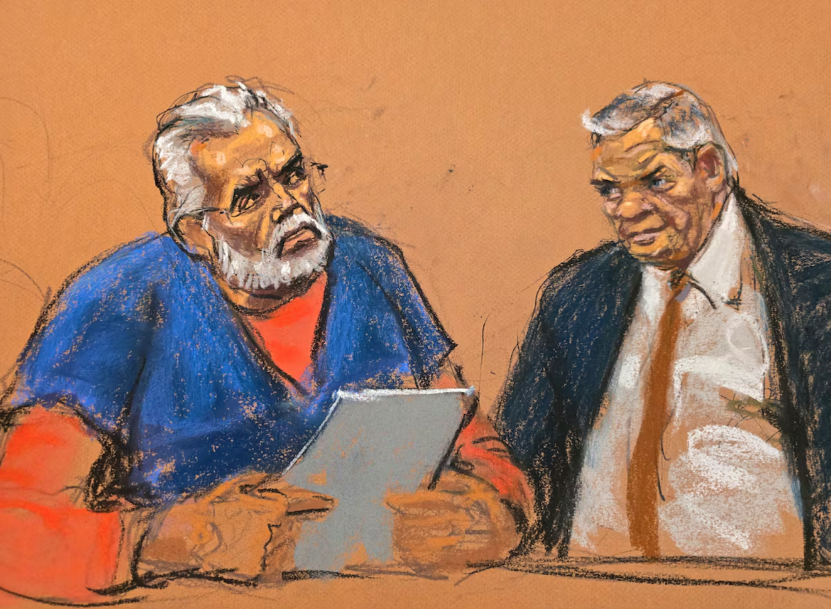 Ilustración de El Mayo Zambada y su abogado, Frank Pérez, el 25 de agosto en el tribunal de Brooklyn. Foto Jane Rosenberg (AP)