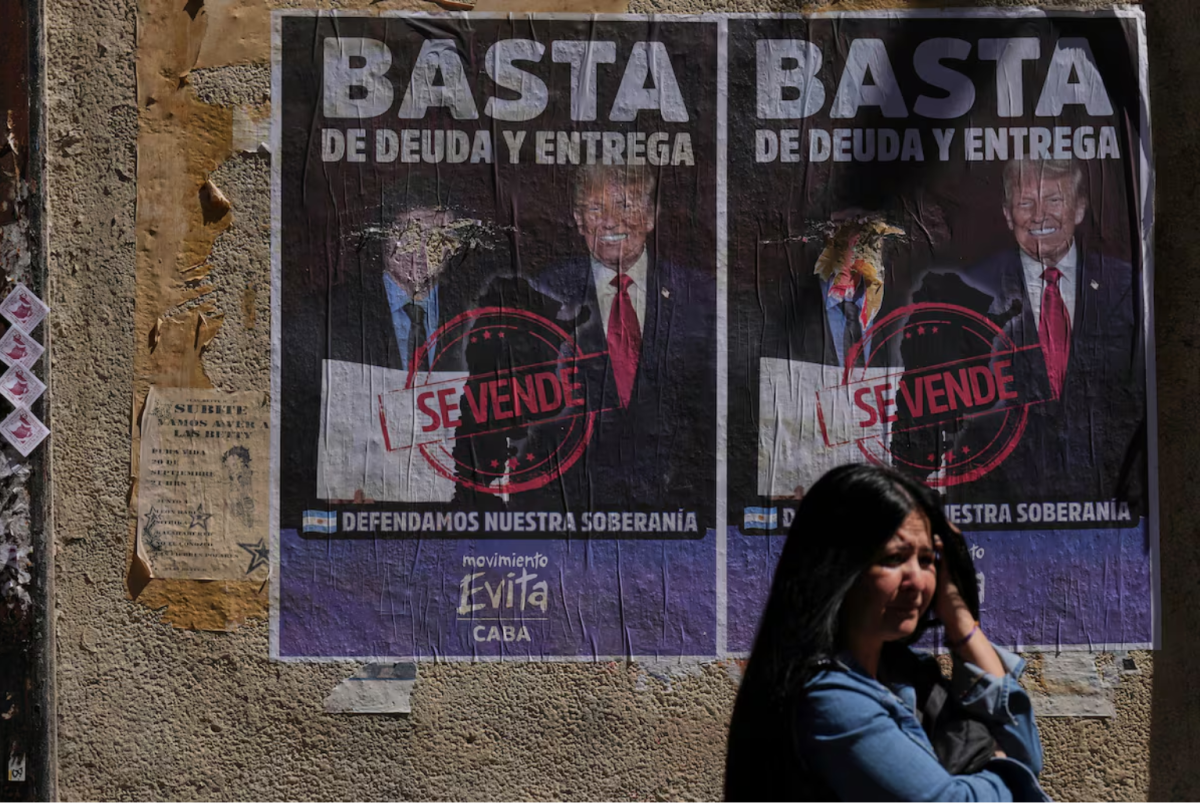 Propaganda en contra de Javier Milei y Donald Trump en Buenos Aires, el 2 de octubre. Foto Natacha Pisarenko (AP)