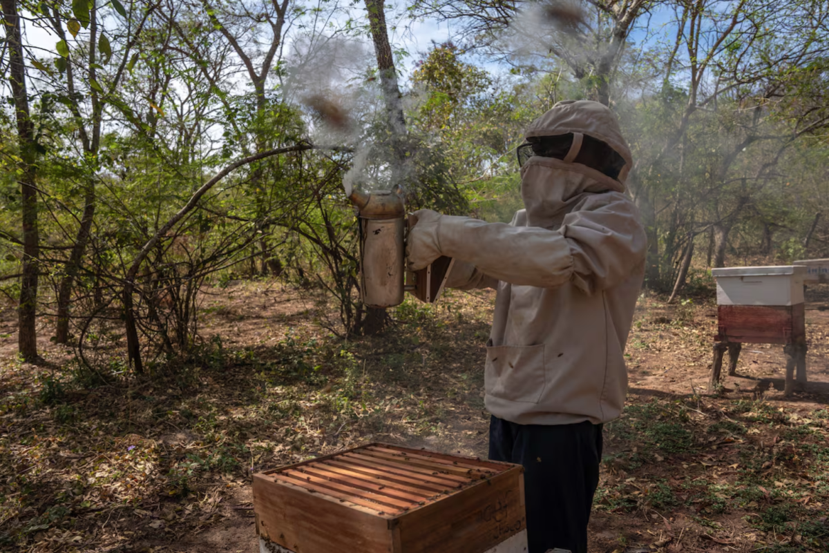 Eliberto Vasquez preparando uno de sus panales de abejas, en Charagua, Santa Cruz (Bolivia). Foto Sara Aliaga