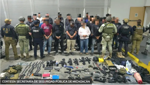 Fuente de la imagen: Cortesía de la Secretaría de Seguridad Pública de Michoacán. En el operativo en Michoacán decomisaron cuchillos y navajas, una pistola nueve milímetros, 19 réplicas de armas de fuego, equipo táctico, simuladores de explosivos, computadoras… “todo lo necesario para un entrenamiento táctico-militar”, dijo el secretario de Seguridad Pública estatal, Juan Carlos Oseguera Cortés.