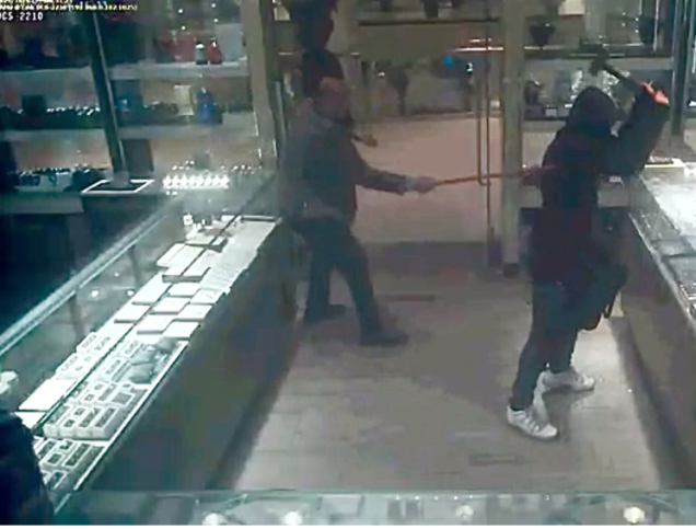 En un momento dado, se ve a uno de los ladrones rompiendo una botella en la cabeza de alguien y luego tomando una segunda botella llena y bañándola, antes de que el personal de seguridad no oficial que se encontraba en el lugar les diera paso y les permitiera abrir la puerta y llevarse su botín.