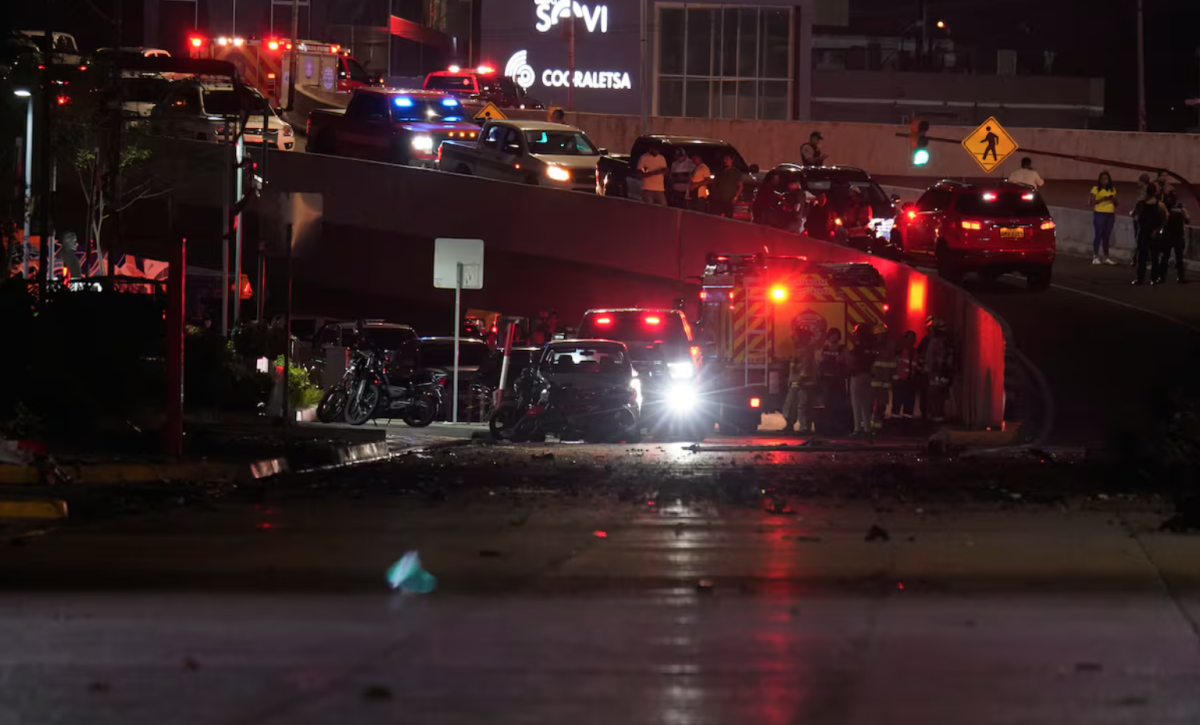 Bomberos y agentes de seguridad inspeccionan los daños de la explosión de un automóvil en Guayaquil, Ecuador, el martes 14 de octubre de 2025.  Foto Cesar Munoz (AP)