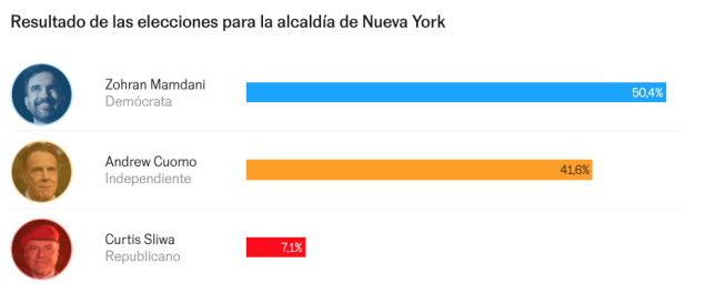 Mamdani ha conseguido más de un millón de votos, el 50% de las papeletas disponibles, y se ha impuesto por nueve puntos sobre el también demócrata Andrew Cuomo (41%), al que derrotó en las primarias del partido y que decidió luego concurrir como independiente. El republicano Curtis Sliwa, sin el apoyo de su partido ni del trumpismo, se queda en un 7%.