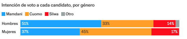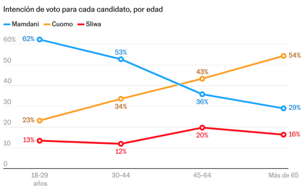 Mamdani habría logrado el 62% de los votos de los jóvenes menores de 30 años y más del 50% entre los 30 y 44 años. En cambio, entre los mayores de 65 años apenas pasa del 29%.