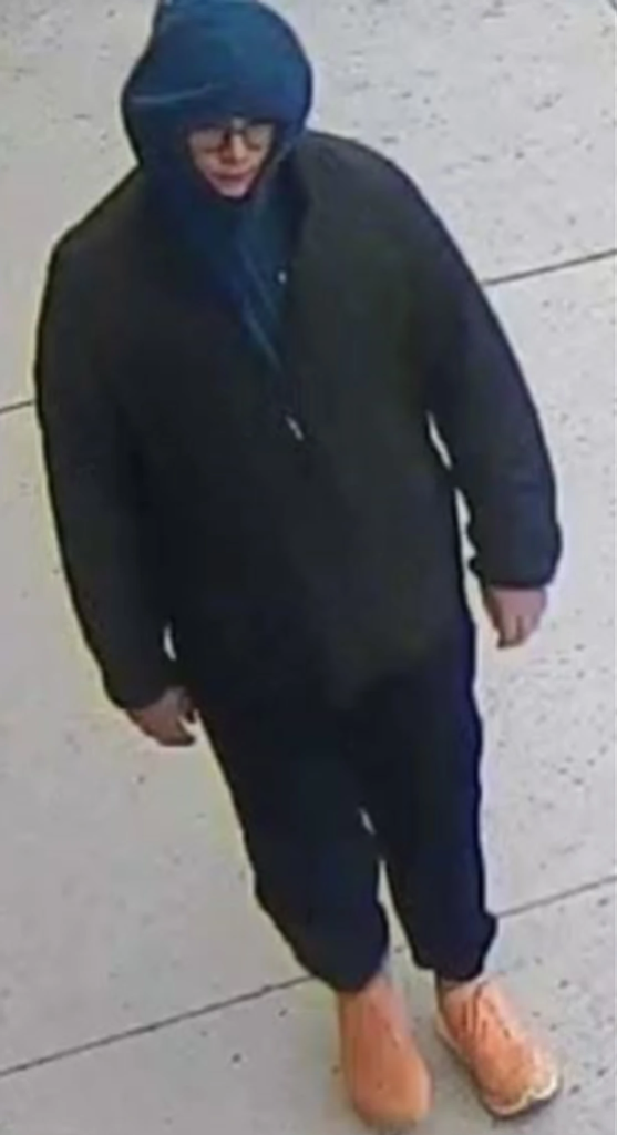 El sospechoso es un hombre blanco, de entre 18 y 22 años, de 1.83 metros de altura y complexión mediana. La última vez que se le vio vestía una sudadera con capucha azul marino, una chaqueta negra, pantalones negros, zapatos naranja brillante y gafas.
