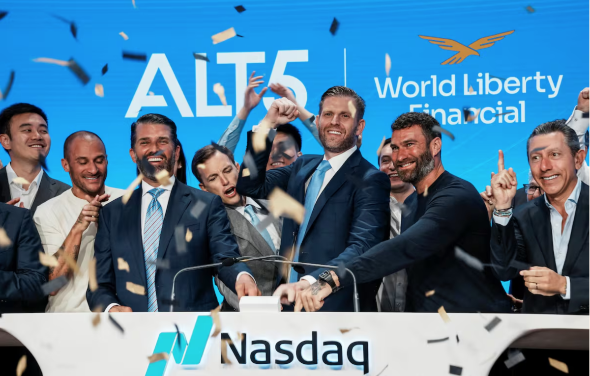 Donald Trump Jr. y Eric Trump celebran el cierre de la oferta de 1.500 millones de dólares de ALT5 en el Nasdaq, en Nueva York, el 13 de agosto de 2025. Foto Eduardo Munoz (REUTERS)