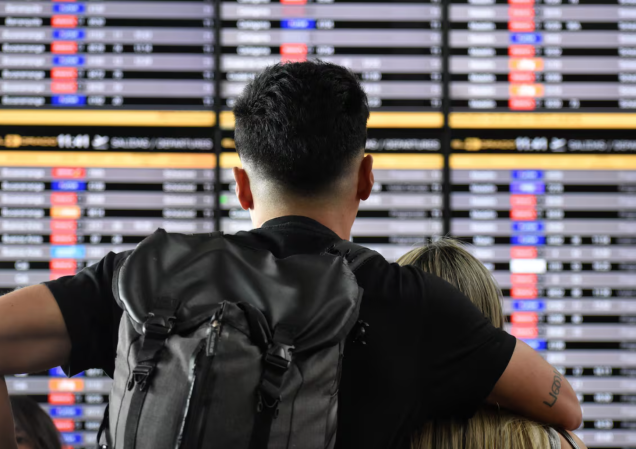 Dos personas esperan un vuelo en Bogotá, en febrero de 2023.  Foto CONTACTO vía Europa Press