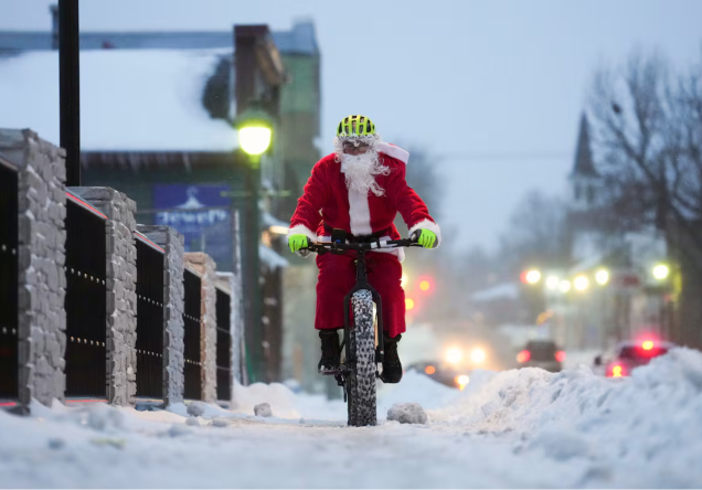 Un Papá Noel se pasea en bicicleta por una calle de Montreal.