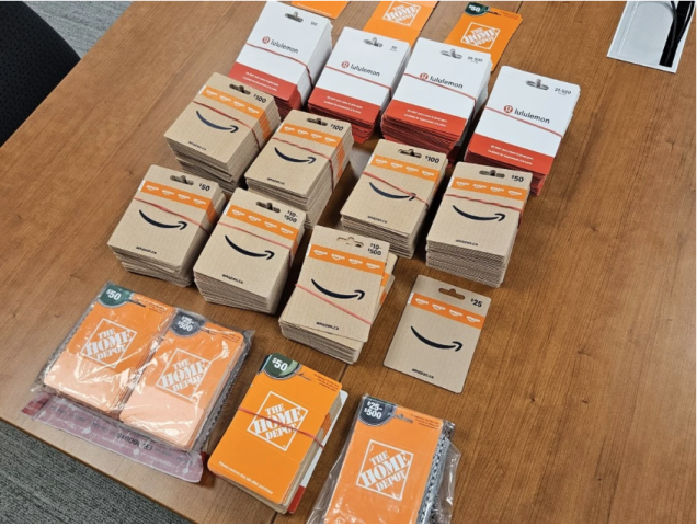 La policía indicó que los agentes encontraron y arrestaron rápidamente al individuo. Durante el arresto, la policía incautó más de 550 tarjetas de regalo de varios comercios, cuyo valor estimado, según la policía, era de entre $27,500 y $133,000 si se activaban. Una foto compartida por la policía muestra tarjetas de regalo incautadas de The Home Depot, Lululemon y Amazon.