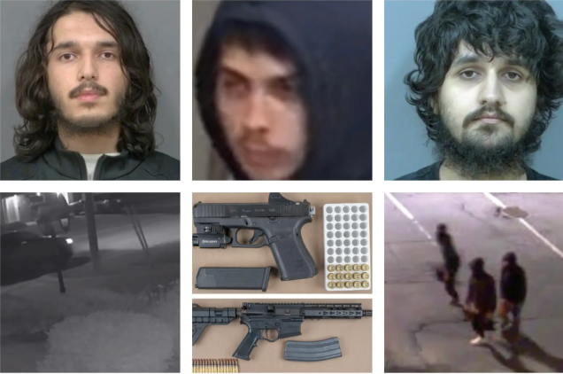 Fahad Sadaat (izquierda), Osman Azizov (centro) y Waleed Khan (arriba), fotos policiales del vehículo, armas de fuego incautadas y, a la derecha, a los tres hampones. Policía de Peel.