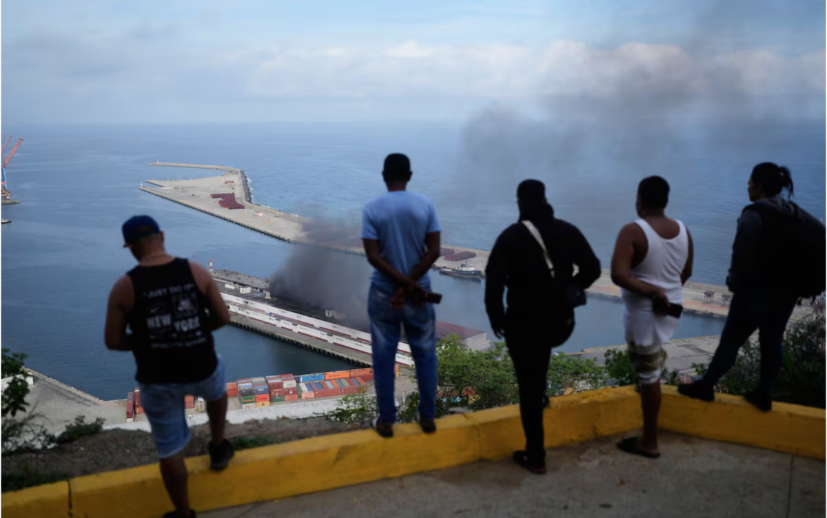 Personas observan desde el muelle tras las explosiones que se escucharon en el puerto de La Guaira, Venezuela, este 3 de enero de 2026. Foto Matias Delacroix (AP)